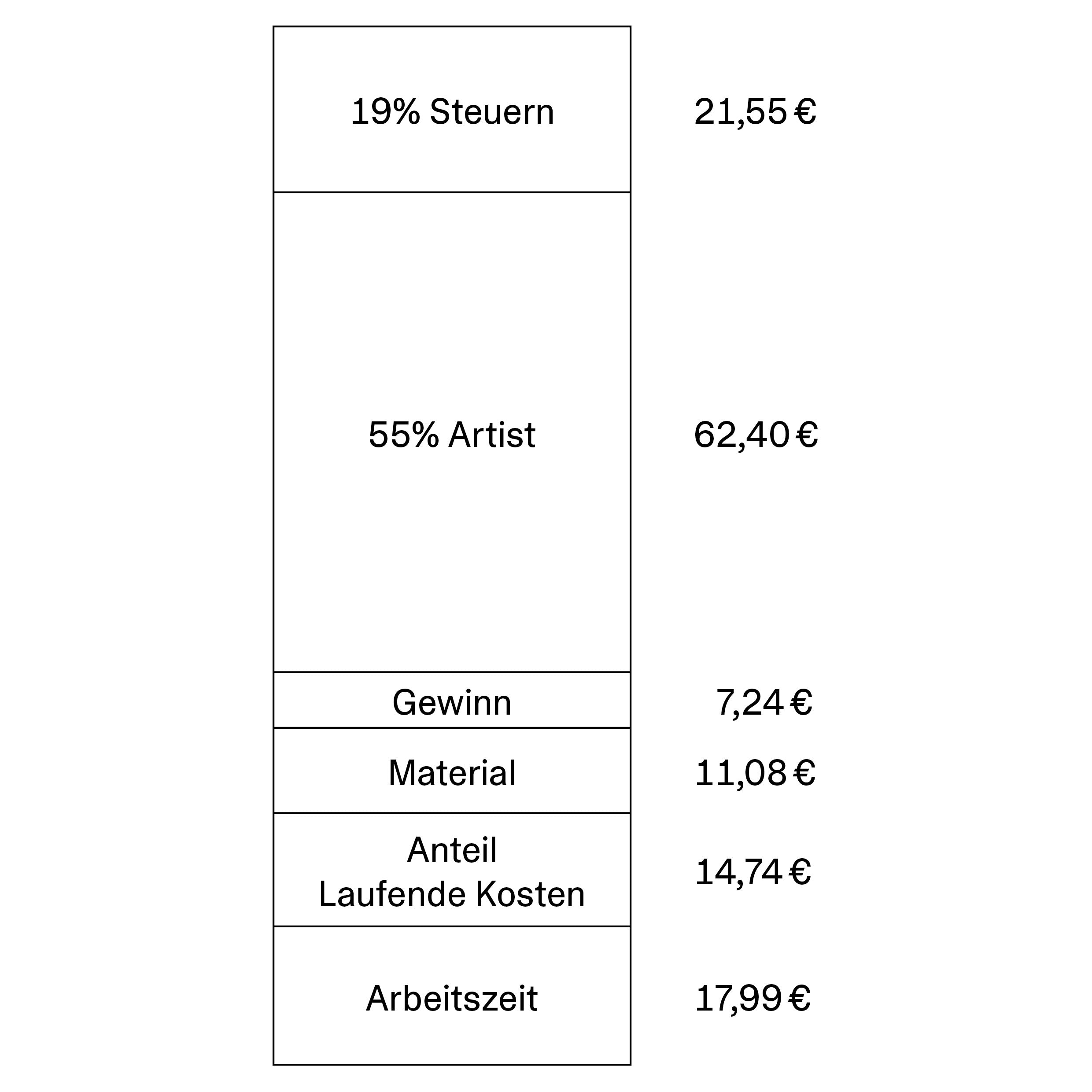 Der duddznt-Anteil am Verkaufspreis teilt sich in vier große Bausteine: Arbeitszeit, laufende Kosten (anteilig), Material und Gewinn. Angenommen wir haben eine Edition in einer 60er Auflage mit drei Farben im Format 50x70cm mit einem Einzelpreis von 135 € brutto pro Print.